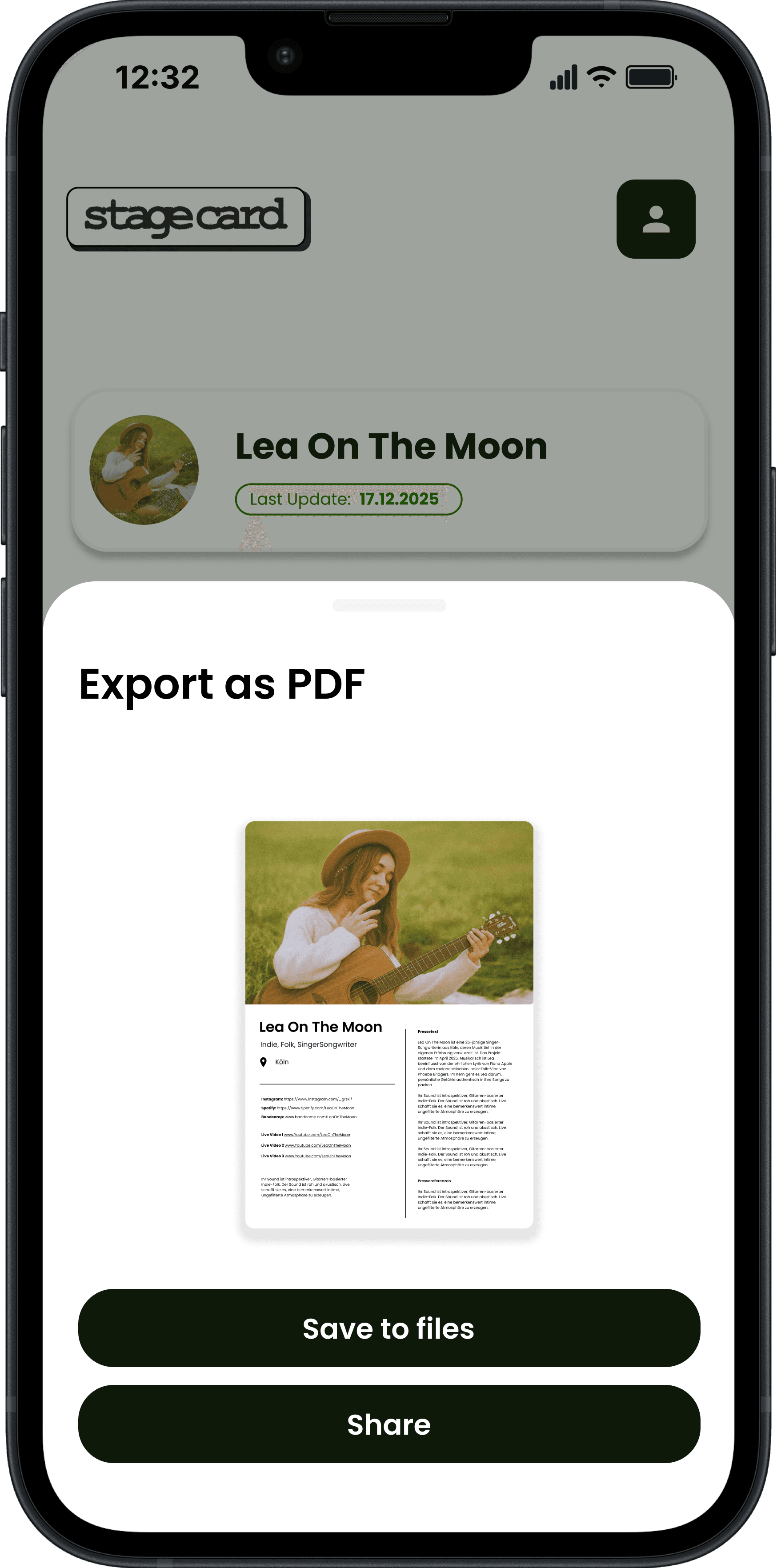 Developed during an intensive Product Design program at Digitale Leute School, Stagecard is a dedicated EPK (Electronic Press Kit) builder. It aims to replace static PDFs and scattered links with a modular, professional, and data-driven portfolio solution for musicians.